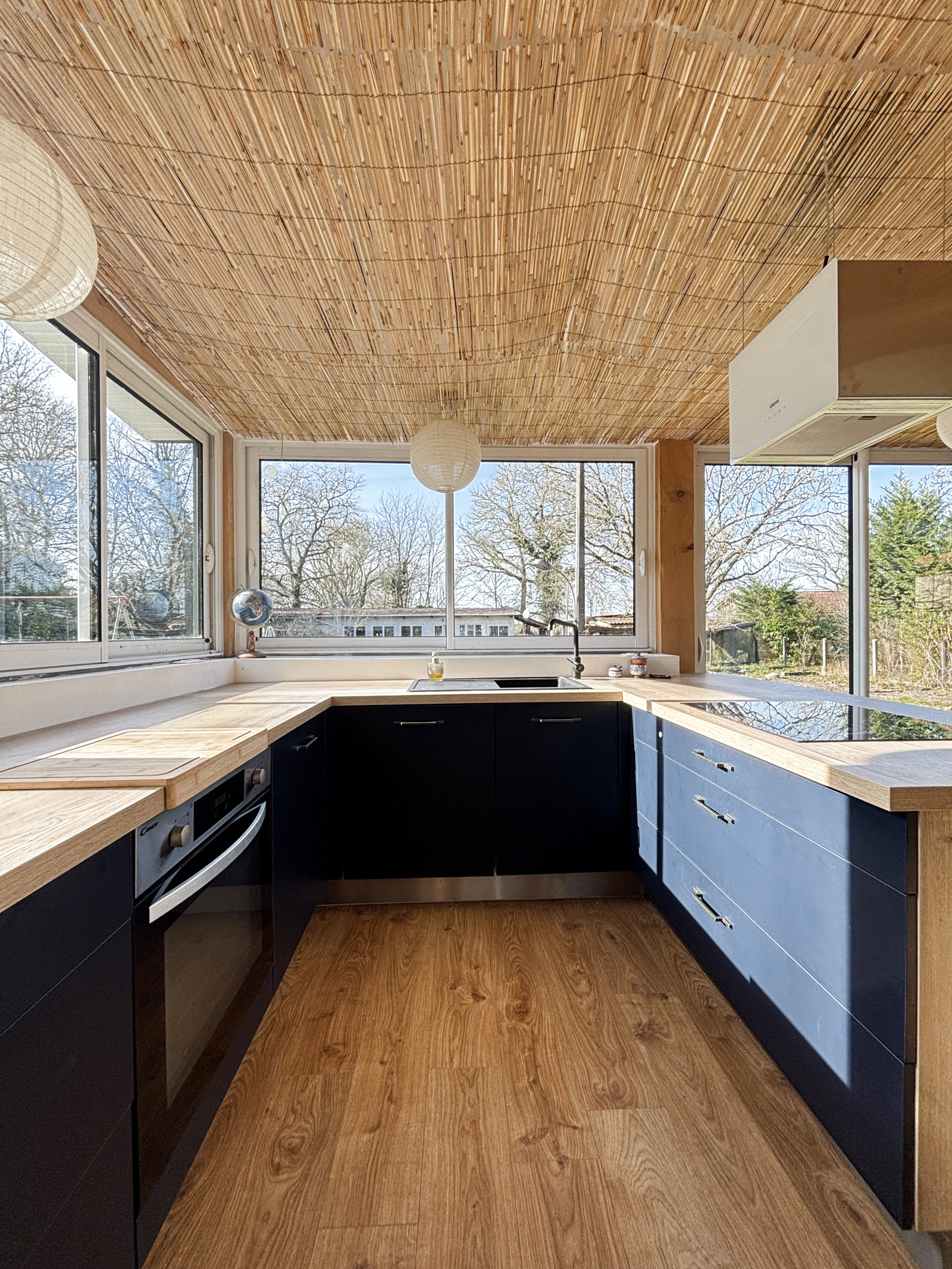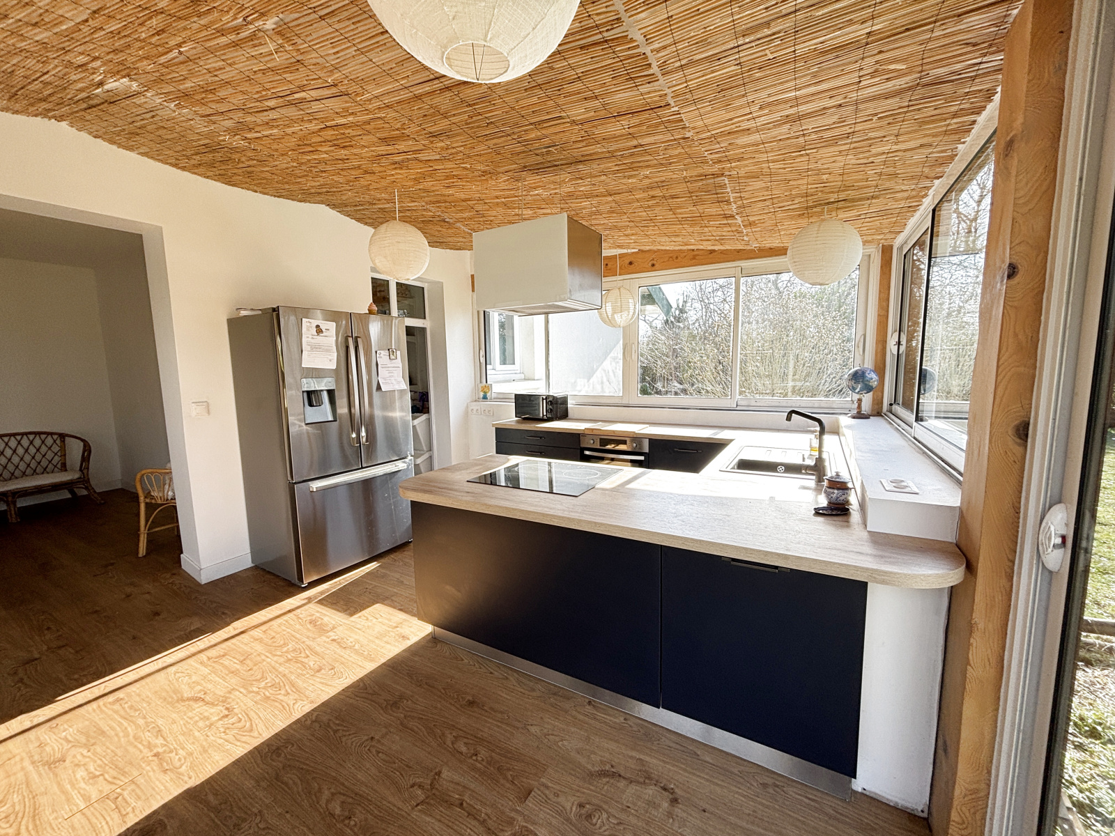 La cuisine , avec son cellier attenant, offre une vue panoramique sur le jardin.
