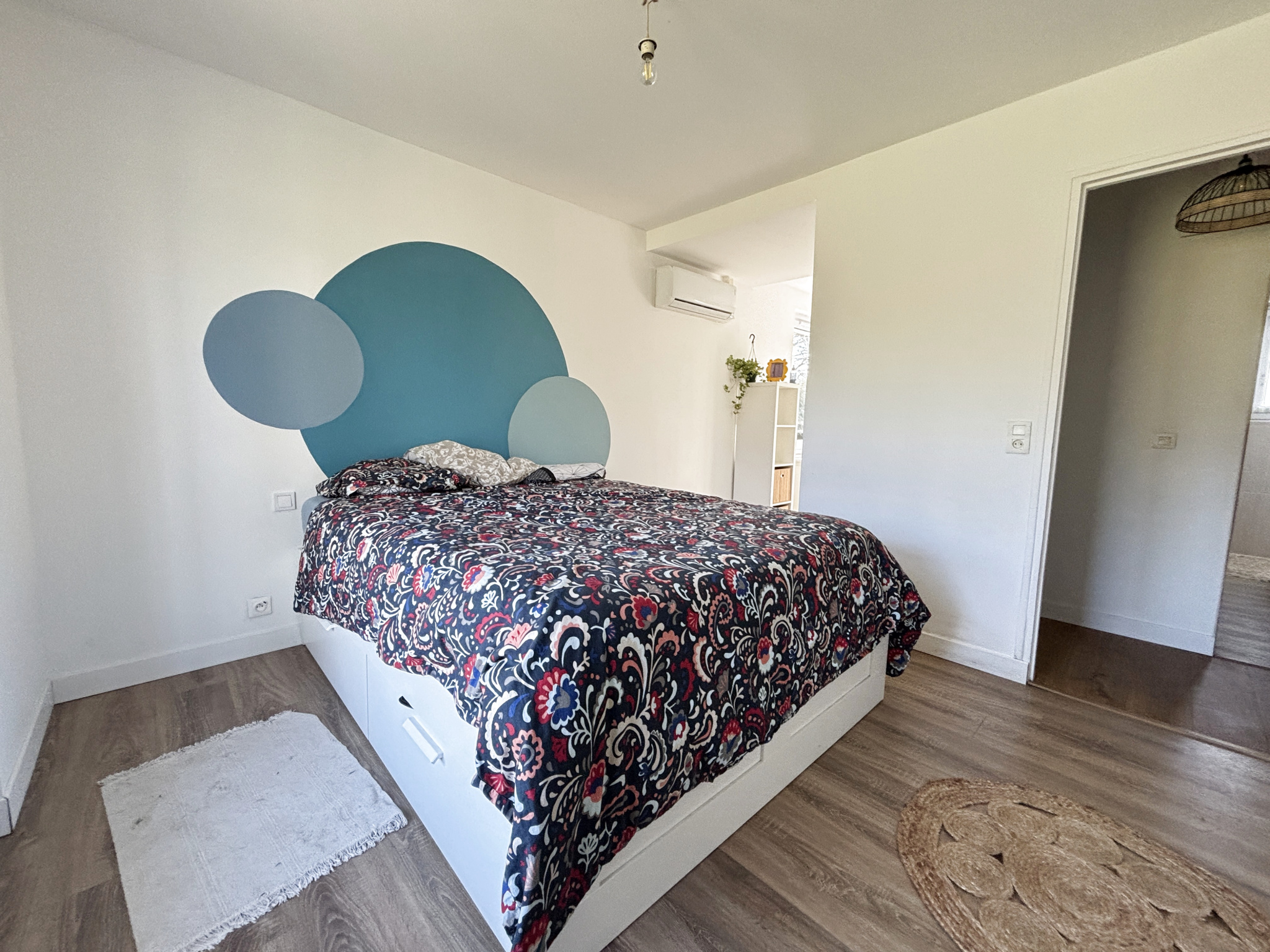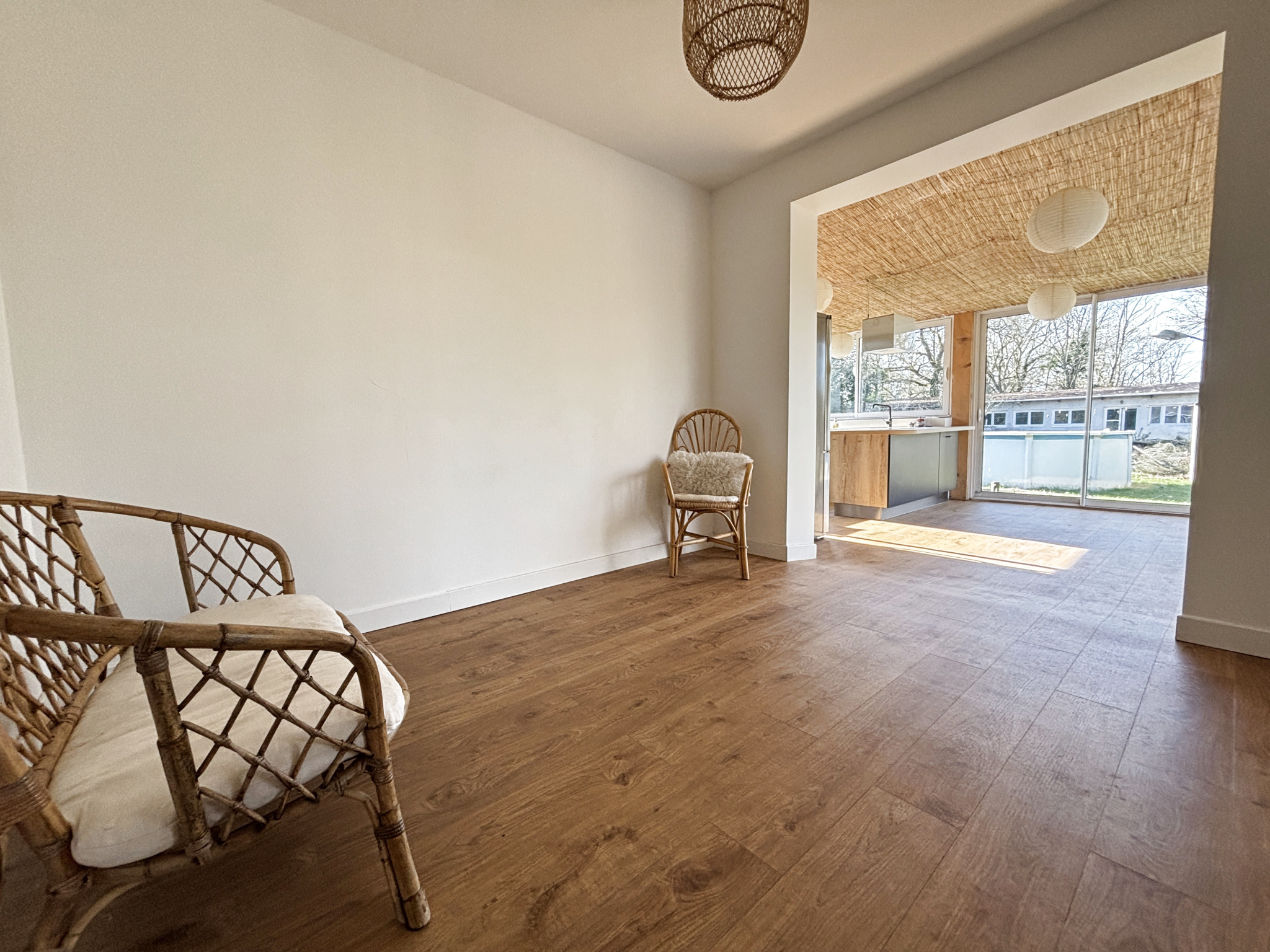 Composée au rez de chaussée d'un séjour lumineux avec cheminée et insert bois , salle à manger ,deux chambres dont une avec un dressing, une salle d'eau et un WC séparé.