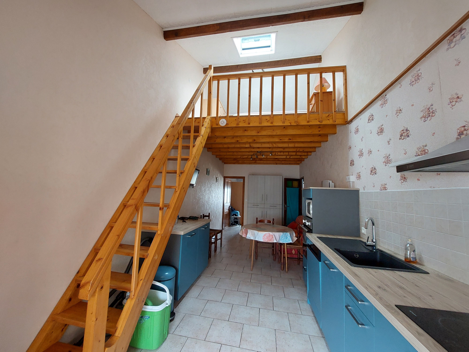 T2 mezzanine (≈35 m²) : cuisine américaine récente et entièrement équipée, séjour lumineux, une chambre, une mezzanine, salle d’eau avec WC et terrasse privative.