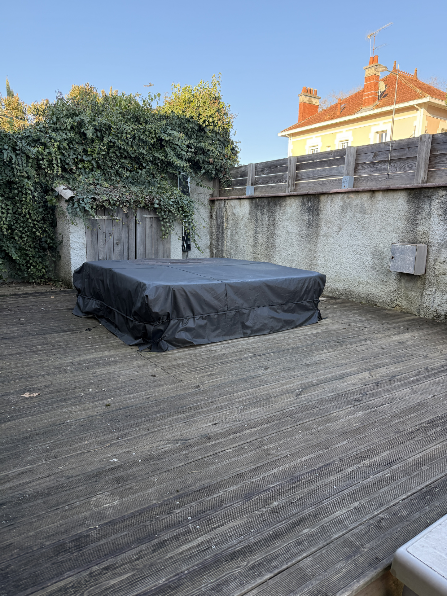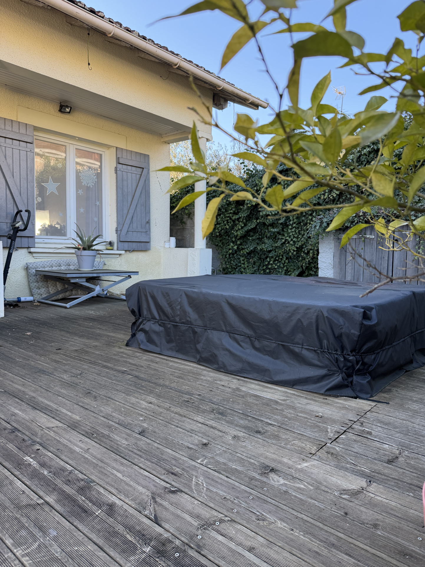 un espace détente avec jacuzzi sur terrasse bois,
